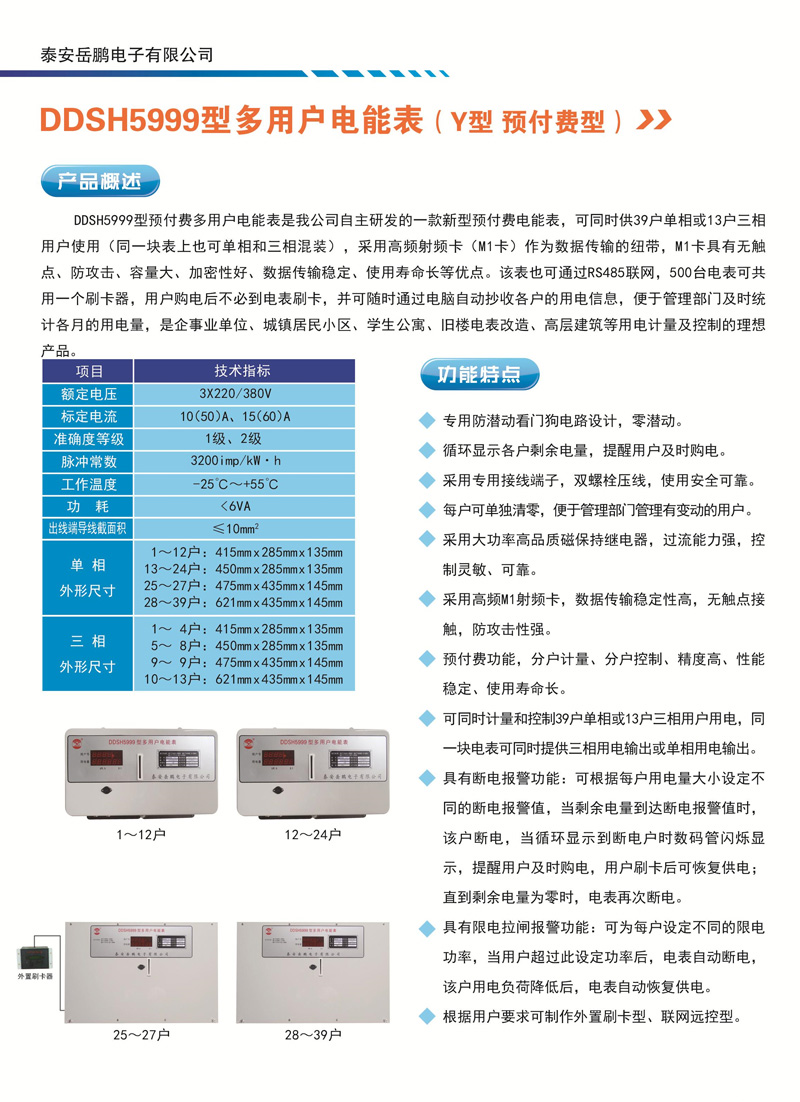 DDSH5999多用戶電能表(預(yù)付費(fèi)型)是我公司自主研發(fā)的一款新型預(yù)付費(fèi)電能表,可同時(shí)供39戶單相或13戶三相用戶使用(同塊表上也可單相和三相 混裝上采用高頻射頻卡(Ml卡)作為數(shù)據(jù)傳輸?shù)募~帶,Ml卡具有無觸點(diǎn)、防攻擊、容量大、加密性好、數(shù)據(jù)傳輸穩(wěn)定、使用 壽命長(zhǎng)等優(yōu)點(diǎn)。該表也可通過RS485聯(lián)網(wǎng)500臺(tái)電表可共用一個(gè)刷卡器,用戶購(gòu)電后不必到電表刷卡,并可隨時(shí)通過電腦自 動(dòng)抄收各戶的用電信息,便于管理部門及時(shí)統(tǒng)計(jì)各月的用電量,是企事業(yè)單位、城鎮(zhèn)居民小區(qū)、學(xué)生公寓舊樓電表改造、 高層建筑等用電計(jì)量及控制的理想產(chǎn)品。